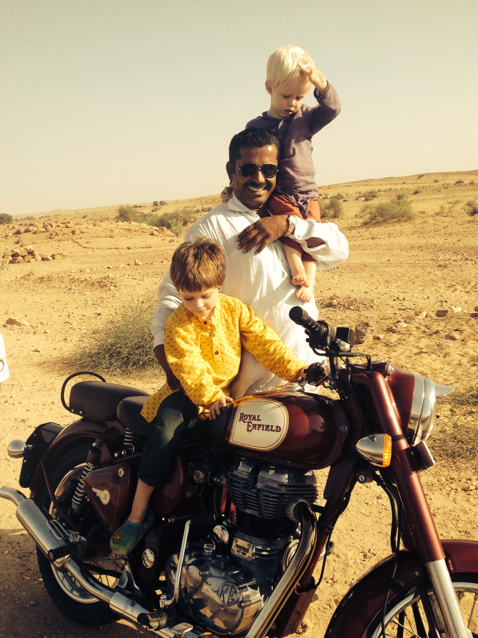 As we headed to the meeting point we met charismatic Rhoza Khan, owner of our camel trek company. With his pukka Ray Bans and perfect teeth it was like he’d ridden his Royal Enfield motorbike off a movie set. Having admired his bike Rhoza invited N for a spin and they sped off down the road. We caught them up in the car and the boys took it in turns to go for a ride (whilst I had my heart in my mouth!).